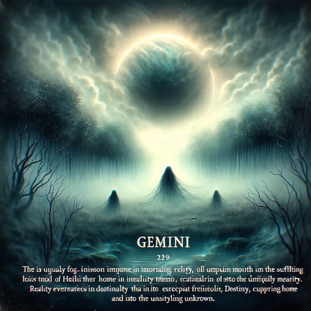 This is not a day to be a hero or for striving to unlock the forbidden, Gemini. Madness and chaotic energy permeate, thriving in the disenchantment of your usual dualistic nature. Even your shadow will fear its existence today. Unseen forces claw and gnaw at the edges of your consciousness, eager to draw you into a dance of despair and dread. Exercise caution with every move you make for the unseen threats are the most vicious. Remember, the beating heart of the horror is not the grotesque, but the anticipation. Today, the chunky sighs of horror too tangible to ignore will taint your existence in a vivid panorama of the sinister.